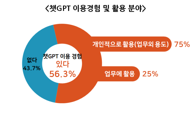 챗GPT를 이용해본 경험이 있다고 한 응답자는 전체의 56.3%로 없다(43.7%) 보다는 높았지만, 활용경험의 75%는 개인적 용도로 업무상 활용은 25%에 그쳤다.