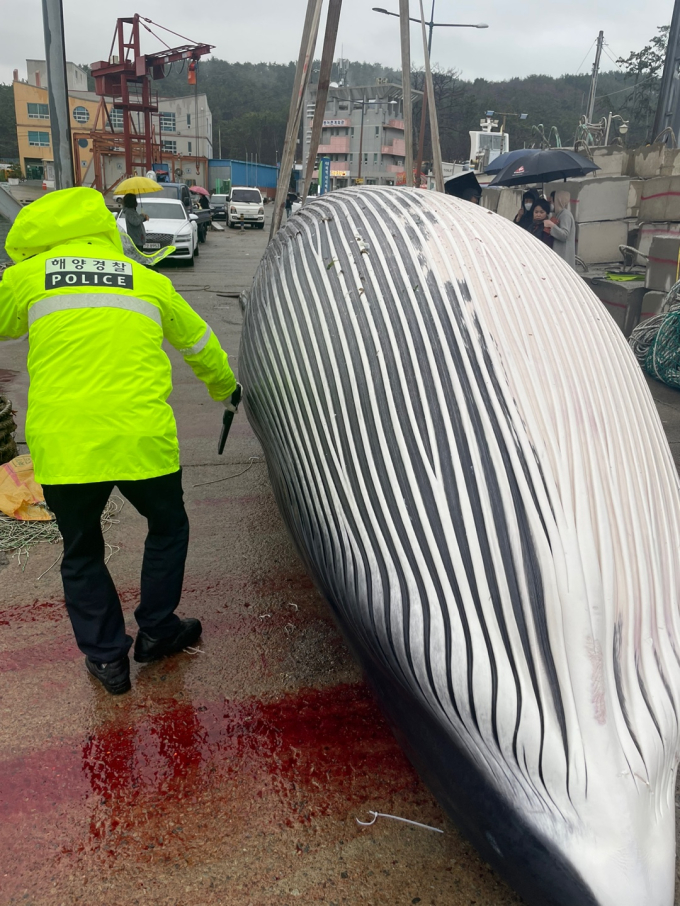 부산에서 발견된 대형 참고래 사체. 남해해양경찰청
