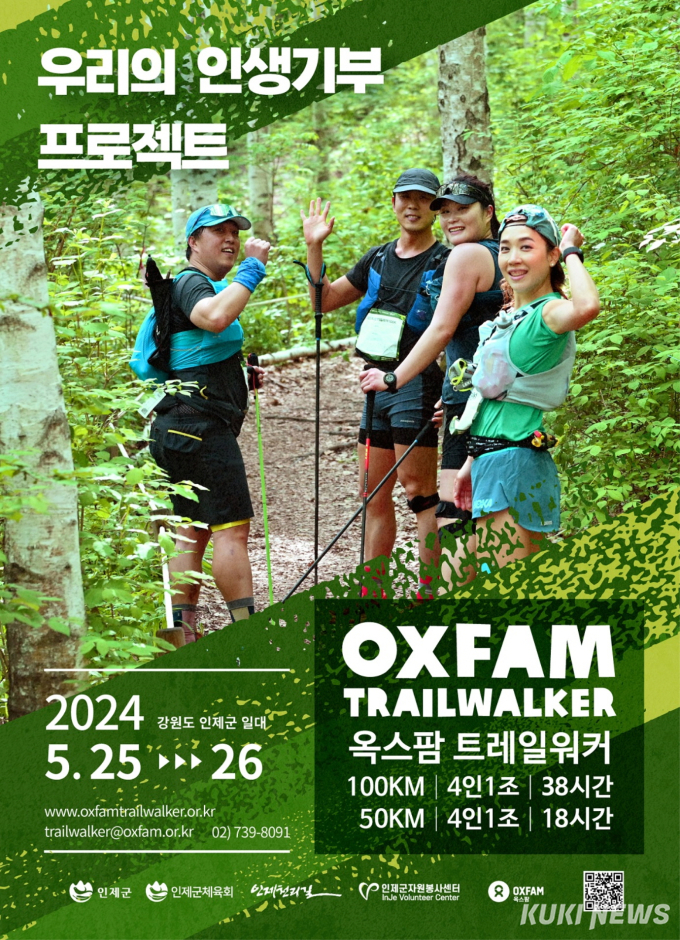 내년 5월 25일과 26일 양일간 강원 인제군 일대에서 개최되는 '2024 옥스팜 트레일워커'는 4명이 한 팀을 이뤄 100km 코스를 38시간 이내에 완주하는 도전형 기부 행사다.