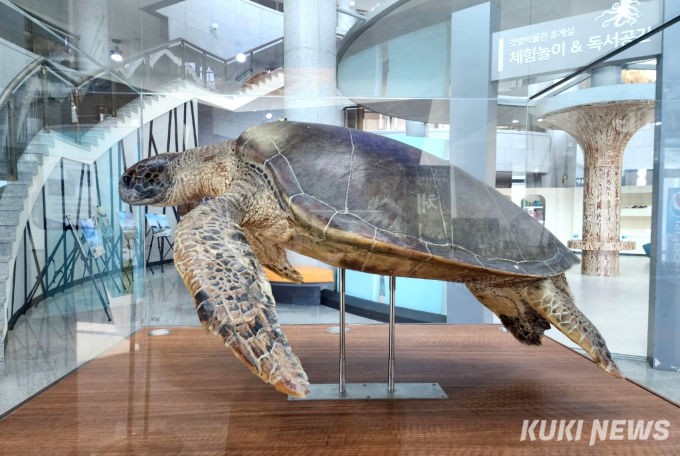 신안갯벌박물관에 전시된 푸른바다거북 표본은 지난 8월 임자도 주민에 의해 사체로 발견됐다. 발견 당시 몸무게는 100㎏, 몸길이 120㎝, 등갑 길이는 86㎝로 대형 개체였다.