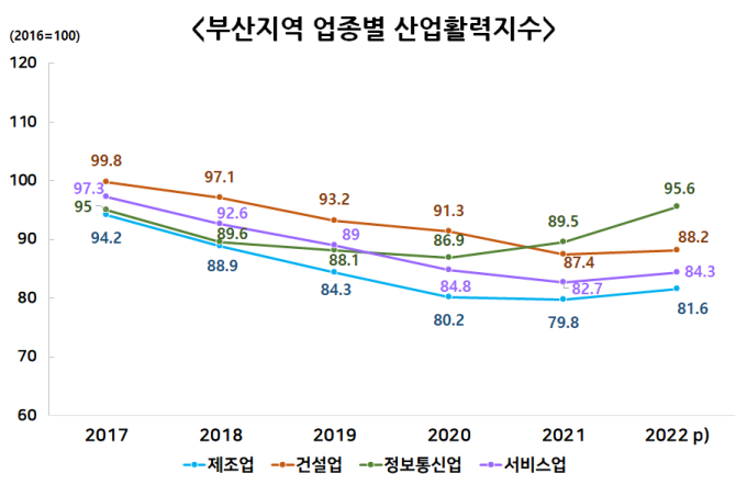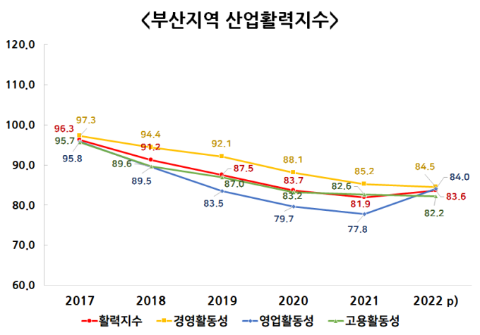 조사에 따르면, 2022년 부산의 산업활력지수는 ‘83.6’으로 기준연도(2016년=100) 이후 하락추세가 이어지고 있는 것으로 나타났다. 코로나19 영향으로 기업활동이 위축되었던 전년(81.9) 대비 소폭 반등하였으나, 여전히 침체가 지속중이다.