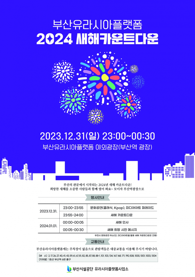 부산시설공단은 올해의 마지막 날인 31일 오후 11시부터 새해 첫날인 2024년 1월 1일 0시 30분까지 부산유라시아플랫폼 광장에서 '유라시아 새해카운트다운'을 개최한다.