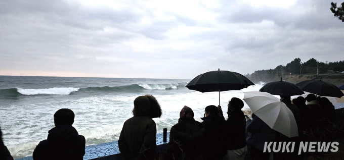 1일 강원 동해시 하평 해변에서 해맞이객들이 일출을 기다리고 있다. 하지만 이날 해상에서 낮은 구름이 유입돼 일출은 볼 수 없었다.