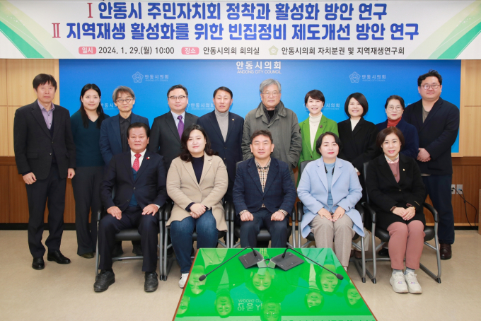 30일 안동시의회에 따르면 최근 자치분권 및 지역재생 연구회는 의회 청사에서 ‘안동시 지역재생·활성화를 위한 빈집정비 제도개선 방안 연구’와 ‘안동시 주민자치회 정착과 활성화 방안 연구’ 최종보고회를 열었다.