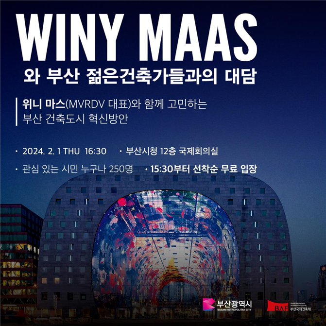 부산 젊은 건축가들과의 대담 포스터.부산시 위니마스 명예자문건축가는 “부산은 2003년 처음 방문한 이래 계속 흥미롭게 지켜보는 도시로, 내가 살고 있는 항구도시 로태르담과 여러모로 닮아있다”라며, “부산이 최근 도시 공간 혁신에 대해 고민한다는 것을 인지하고 있는 만큼 더 나은 도시공간 조성에 조금이나마 이바지할 수 있다면 이는 뜻깊은 일”이라고 전했다. 아울러, “부산의 지역성에 대한 이해를 바탕으로 세계적으로 경쟁력 있는 도시공간을 만들어 나갈 수 있도록 자주 소통하고 실속 있는 조언을 드리겠다”라고 위촉 소감을 밝혔다.
