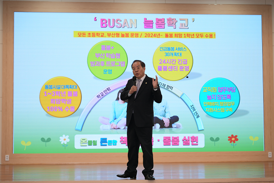 하윤수 부산광역시교육감이 1일 해운대교육지원청, 영도·북·해운대구 관내 학부모, 지역주민 등 500여 명을 대상으로 영도구청 등지에서 열린 ‘부산형 늘봄 확대 정책 설명회’에서 특강을 하고 있다.