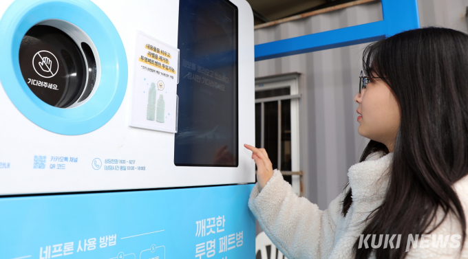 무인회수기에 투명페트병을 투입하면 회수기는 페트병을 자동으로 인식·압축하고, 라벨이 부착돼 있거나 오염된 페트병은 반환한다.