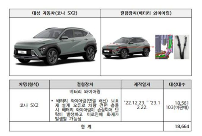 8일 국토부에 따르면 현대차 코나 SX2 1만8664대는 배터리 와이어링(연결 배선) 보호재의 설계 오류로 오는 15일부터, 넥쏘 246대는 커튼 에어백 인플레이터(전기 신호를 받아 에어백을 부풀리는 장치)의 제조 불량으로 오는 14일부터 시정조치에 들어간다.