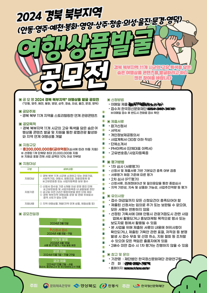 접수는 오는 4월 8일과 9일 양일간 이메일로 진행하며, 경북 11개 시·군에 소재한 관광 관련 기업과 단체라면 누구나 지원할 수 있다.