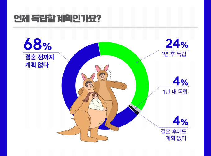 지난해 포커스미디어 엘리베이터TV가 설치된 단지 입주민 중 부모님과 함께 사는 25~39세 196명에게 독립 계획을 물어본 결과, 10명 중 7명이 △결혼 전까지는 독립 계획이 없다'(68%)고 답했다. △1년 후 독립 계획은 24% △1년 내 독립 계획은 4%였다. △결혼 후에도 독립 계획이 없다고 말한 입주민도 4%를 차지했다.