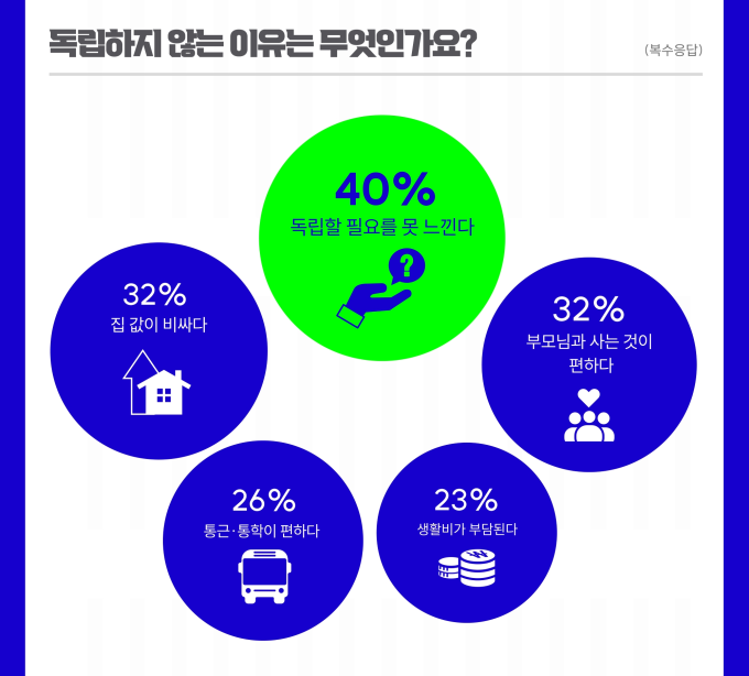 - 경제적 이유 보다 "딱히 독립 필요 못 느낀다, 부모님과 사는 게 편하다" 등 부모의 의식주 제공에 익숙해져