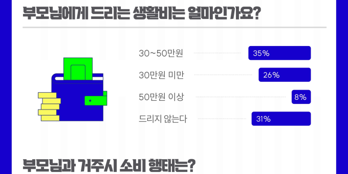 부모님과 함께 사는 캥거루족 10명 중 7명(69%)은 매달 부모님에게 생활비를 드리고 있었다. 생활비 수준은 △30~50만원(35%) △30만원 미만(26%) △50만원 이상(8%) 순으로 나타났다. 반면, △생활비를 드리지 않는 캥거루족도 31%로 비중이 컸다.