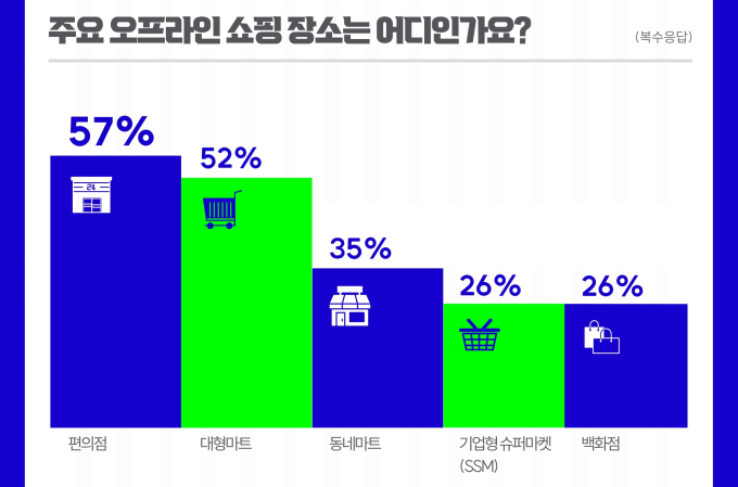캥거루족의 주요 오프라인 쇼핑 장소는 △편의점(57%, 복수응답)이 1위였다. 24시간 운영으로 시간에 구애받지 않고 소량 구매가 빈번하기 때문인 것으로 분석된다. △대형마트(52%)가 2위를 차지했는데 가족들이 장보러 갈 때 동행하는 것으로 보인다. △동네마트(35%)와 △기업형 슈퍼마켓인 SSM(26%) △백화점(26%)이 뒤를 이었다.