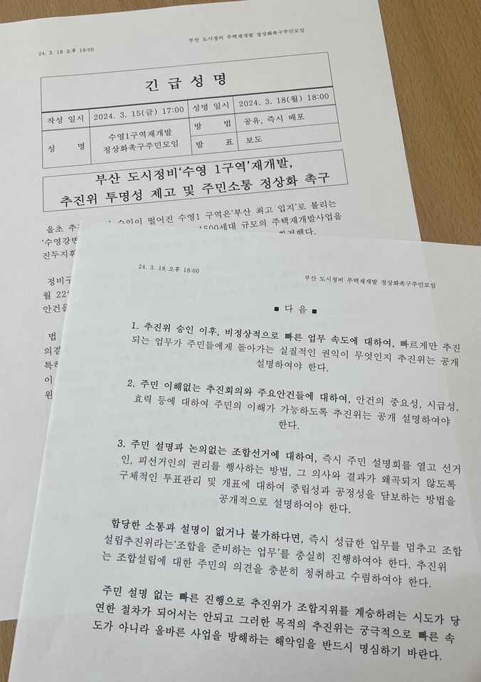 성명서 사본.수영1구역재개발 정상화 촉구 주민 모임 이런 가운데 '재개발' '재건축' '리모델링' 사업진척 과정에 상당수 주민들은 투명성과 소통 등이 절대적으로 부족하다며 불만을 드러내고 있다.