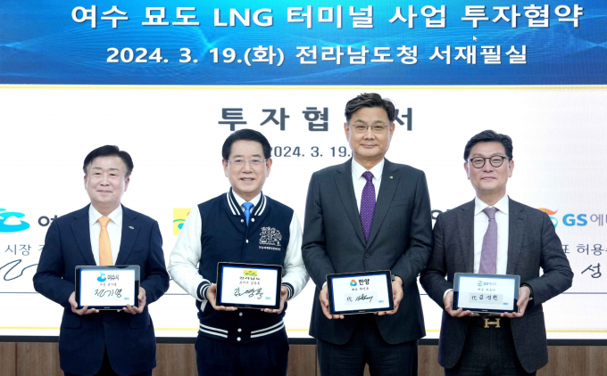 전남도는 19일 도청 서재필실에서 ㈜한양, GS에너지㈜, 여수시와 함께 여수 묘도 액화천연가스(LNG) 터미널 사업 투자협약을 하고, 터미널 사업의 성공과 지역경제 활성화를 위해 힘을 모으기로 했다.