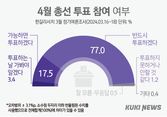쿠키뉴스 의뢰로 여론조사 전문기관 한길리서치가 지난 16~18일 전국에 거주하는 만 18세 이상 1008명을 대상으로 ‘4·10 총선 투표 의향’을 물은 결과, 전체 응답자 중 77.0%가 ‘반드시 투표하겠다’라고 답했다.
