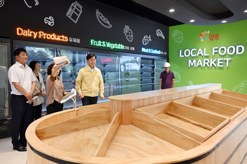 안병구 시장(왼쪽 네 번째)이 11일 함양~울산 고속도로 ‘영남루휴게소 로컬푸드 직매장’ 사업 현장을 방문해 진행 상황을 점검하고 있다. △ 안정적 판로를 책임지다, “영남루휴게소 로컬푸드 직매장” 마지막 방문지인 함양~울산 고속도로 ‘영남루휴게소 로컬푸드 직매장’은 청년 농업인과 지역 농가의 소득 증대를 위한 핵심 판로다. 오는 10월 개장 예정인 이곳은 단순한 판매점을 넘어, 밀양의 우수 농특산물과 가공품, 굿즈를 판매하고 밀양 관광을 알리는 복합문화공간으로 조성된다.
