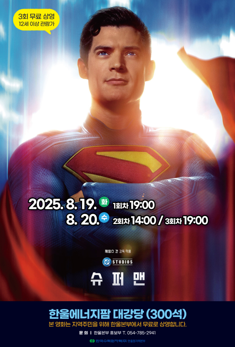 한울원전에 따르면 슈퍼맨은 19~20일 한울에너지팜 대강당에서 상영된다.