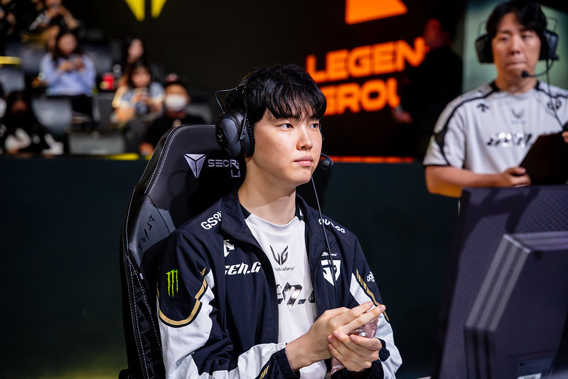 1세트 한화생명이 ‘기인’ 김기인의 그웬을 집중 공략했다. ‘제우스’ 최우제의 럼블이 과성장했다. 젠지도 ‘바이퍼’ 박도현의 유나라를 두 번 끊어 반격했다. 젠지는 17분 드래곤 전투에서 대승했고 3스택을 쌓았다. 그들은 26분 ‘딜라이트’ 유환중의 알리스타를 잡고 시야를 장악해 바론을 얻었다. 젠지는 재정비에 나섰고 그대로 넥서스를 부쉈다.