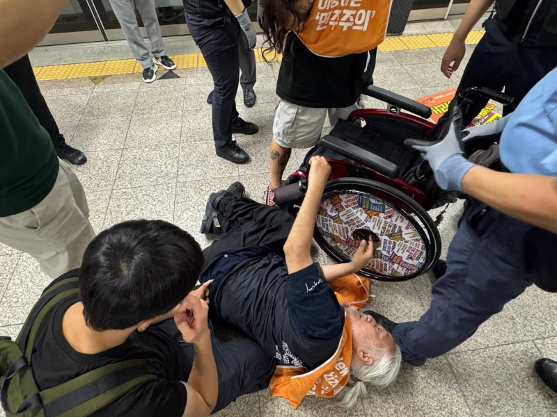 전국장애인차별철폐연대(전장연) 시위로 서울 지하철 4호선 열차가 명동역을 1시간 동안 서지 않고 통과했다.
