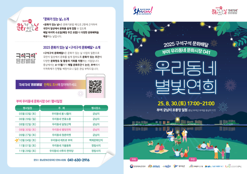 충남문화관광재단은 ‘문화가 있는 날’ 주간을 맞아 30일 오후 5시부터 9시까지, 부여 궁남지 포룡정 일원(충남 부여군 부여읍 동남리 117)에서 2025 구석구석 문화배달 부여 4회차 ‘우리동네 별빛연희’를 개최한다고 18일 밝혔다.