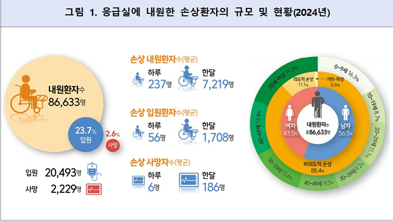 질병관리청은 28일 ‘2024 손상유형 및 원인 통계’를 공개했다. 통계는 전국 23개 병원 응급실에 내원한 손상 환자 현황과 특성을 분석한 결과다.