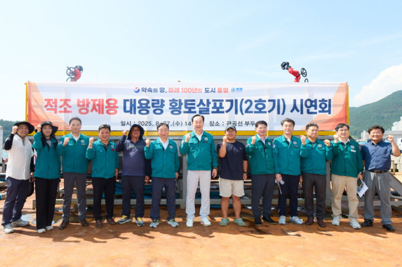 적조 발생 우려 해역에 장비를 현장 배치(대용량 1대, 중형 5대)했다. 이날 시범운영에는 천영기 통영시장, 신철기 통영시의회부의장 외 의원 3명, 경상남도 해양수산국장 등 참석해 적조방제 준비사항을 확인하고 및 황토살포기 시운전을 관람했다.
