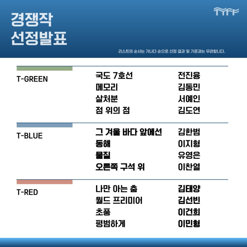 예심 심사에는 통영영화제 프로그래머인 최정민 감독을 비롯해 형슬우 감독, 홍서백 배우 겸 감독, 임혜영 감독이 참여했으며 T-그린(여행·가족·환경), T-블루(로컬·바다), T-레드(예술·예술인) 3개 섹션으로 나누어 심사가 이뤄졌다.