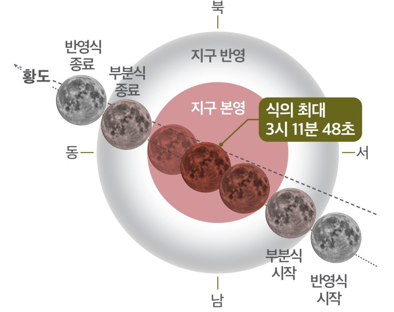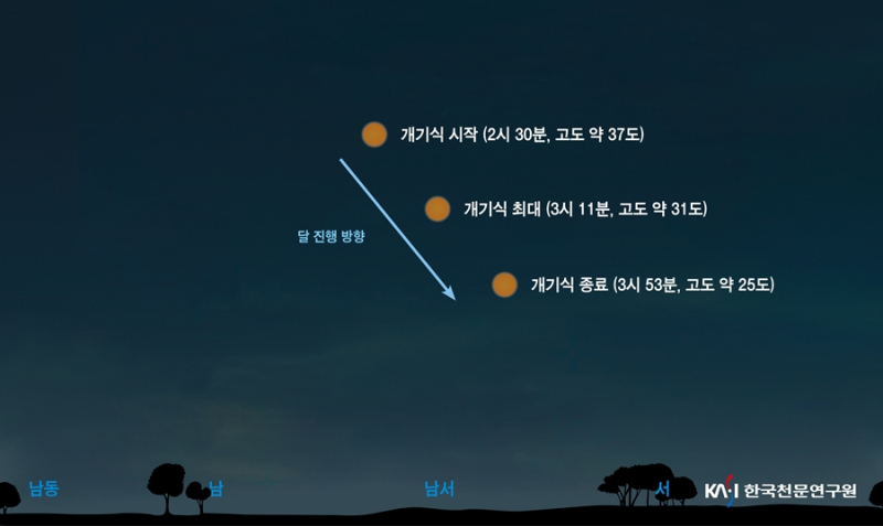 이번 개기월식은 이날 오전 0시 26분 54초 지구 반그림자에 달이 들어가는 반영식을 시작으로, 달이 지구 본그림자에 일부분 가려지는 부분식이 오전 1시 26분 48초에 열린다.