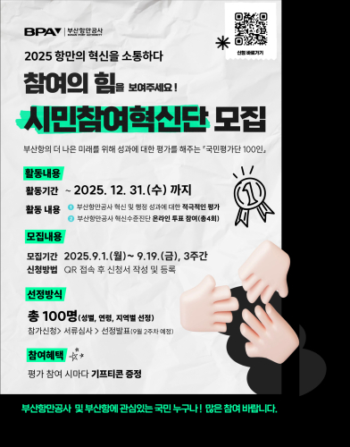 부산항만공사(BPA)는 국민 의견을 항만 정책과 서비스 개선에 반영하기 위해 부산항 시민참여혁신단을 모집한다고 1일 밝혔다.