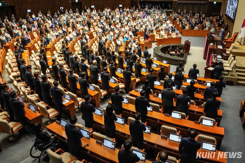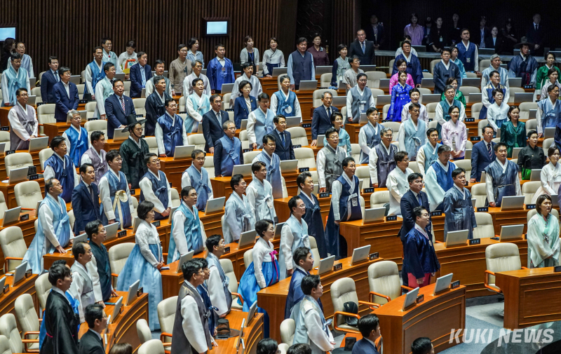 양당은 1일 국회에서 열린 ‘정기국회 개회식’에서 복장부터 분위기 차이를 보였다. 민주당은 당의 색상인 푸른색 한복을 입고 2025 경주 아시아태평양경제협력체(APEC) 홍보에 돌입했다. 반면 국민의힘은 입법폭주에 반발해 상복(喪服)에 근조 리본을 달고 본회의에 입장했다.