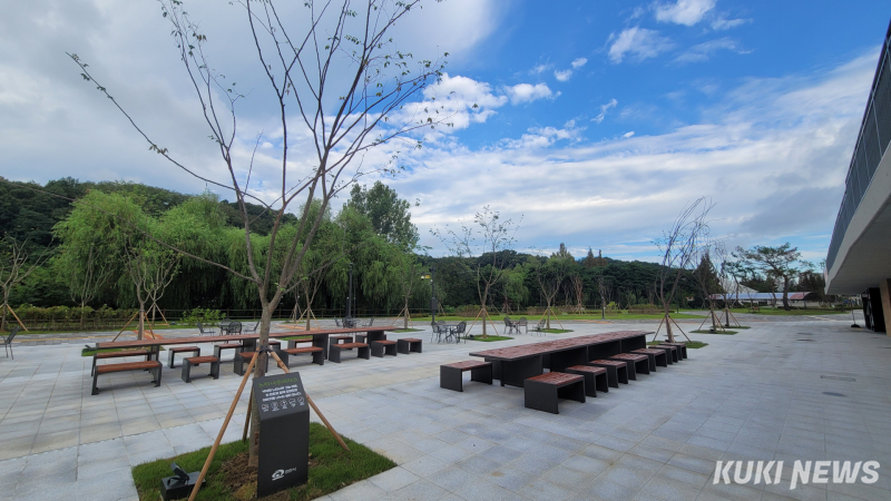 매점 옆의 ‘느티나무 테라스’. ‘넉넉한 느티나무 그늘아래, 차 한잔과 함께 도란도란...’ 안내문이 무색하다. 애목 몇 그루 심어 놓고, 주위에 긴 탁자와 의자 여러 세트를 배치했다. 썰렁하기 그지없다. 시는 “교관목 59종, 9만5000여주를 심었다”고 홍보했는데 모두 덜 자란 나무들 뿐인가?