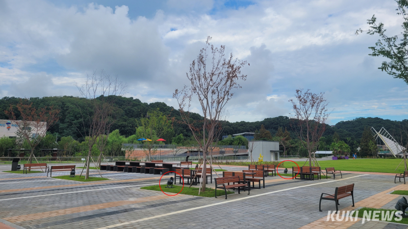 삼거리공원의 새로 조성한 지역은 큰 나무가 없다. 많은 시설이 뙤약볕을 그대로 받고 있다.