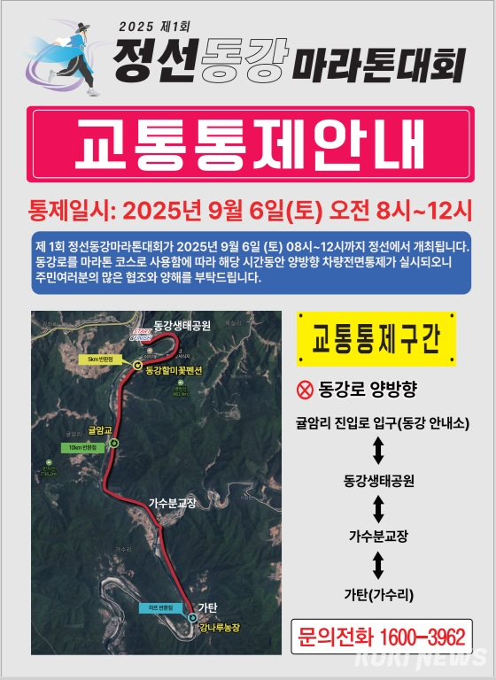 김재성 문화체육과장은 “전국 규모 마라톤대회가 정선에서 처음으로 열리는 만큼, 군민 여러분의 적극적인 관심과 협조가 필요하다”며 “교통통제 구간을 미리 확인해 불편을 최소화하고, 대회를 통해 정선의 아름다움과 활력을 널리 알릴 수 있도록 함께해 주시길 바란다”고 당부했다.