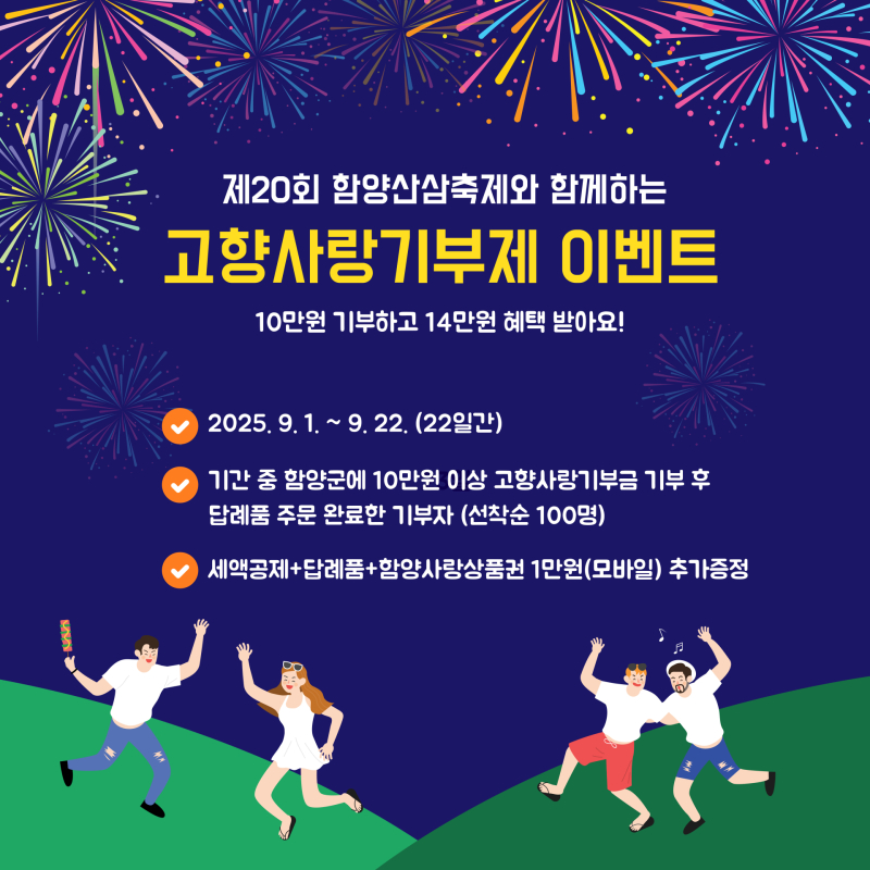 함양군은 9월1일부터 22일까지 22일간 ‘제20회 함양산삼축제’와 연계한 고향사랑기부제 이벤트를 실시한다.