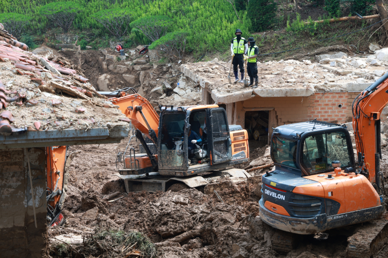 군 및 소방 인력들이 중장비를 이용해 피해 복구 작업을 하고 있다.