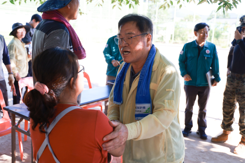 이승화 산청군수가 집중호우 피해 주민을 만나 위로를 건네고 있다.