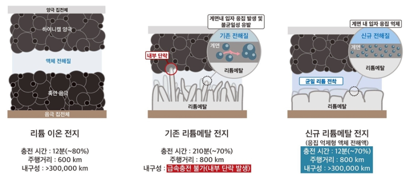 공동연구팀은 리튬메탈이 급속충전 시 덴드라이트 형성의 근본적 원인이 리튬메탈 표면에서 불균일한 계면 응집반응 때문임을 규명, 이 문제를 해결할 수 있는 응집 억제형 신규 액체 전해액을 개발했다.