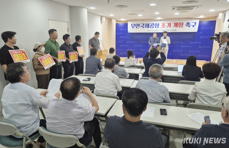관광협회 등 업계 관계자 50여 명은 4일 전남도의회 브리핑룸에서 기자회견을 열고 “무안국제공항 장기 폐쇄는 단순한 교통 불편이 아닌 광주‧전남 관광의 생존이 달린 일”이라며 정부 측에 “무안국제공항의 조기 개항을 책임감 있게 해 줄 것”을 요구했다.