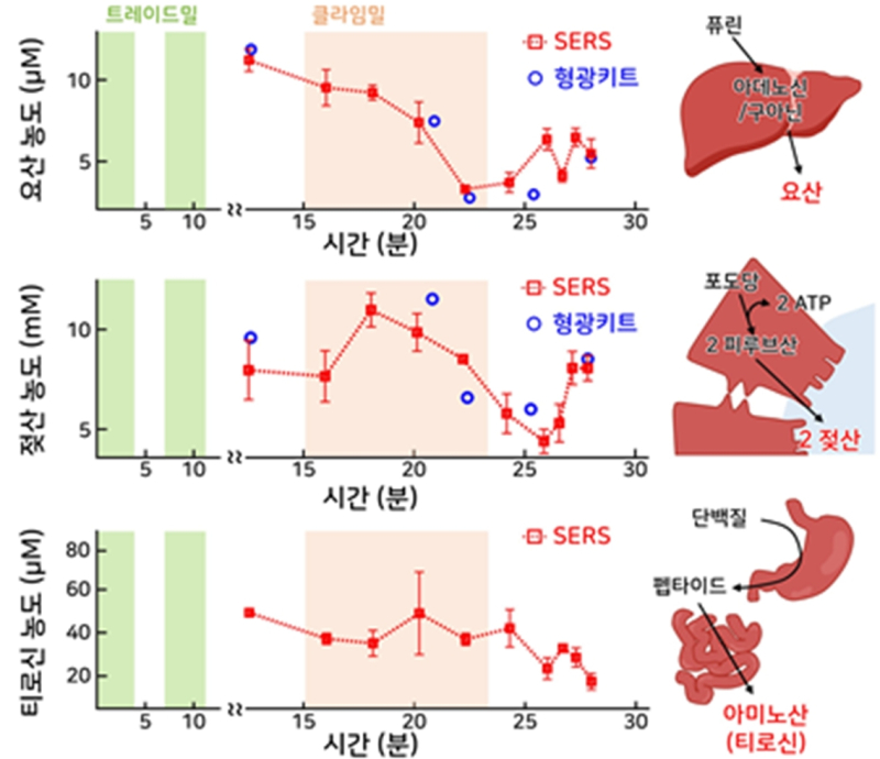 그러나 이번 연구에서는 요산, 젖산, 티로신 등 대사·운동·질환 관련 중요 바이오마커 세 가지 대사물질이 운동과 식단에 따라 어떻게 변하는지 세계 최초로 정량 분석했다.