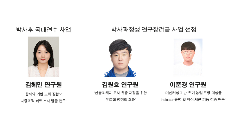 응용식물과학과 박사과정의 이준경 연구원(지도교수 황선구)은 ‘머신러닝 기반 유기농업 토양 미생물 Indicator 규명 및 핵심 세균 기능 검증 연구’를, 농림축산융합학과 박사과정의 김원호 연구원(지도교수 이학준)의 경우 ‘산불피해지 토사 유출 저감을 위한 우드칩 멀칭 효과’를 주제로 연구를 수행한다.