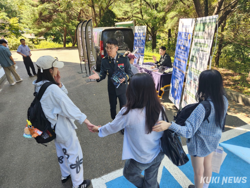 이날 육군 홍보팀이 운영한 부스를 방문한 간호학과 등 학생들이 관심을 보이고 있다. 윤수용 기자