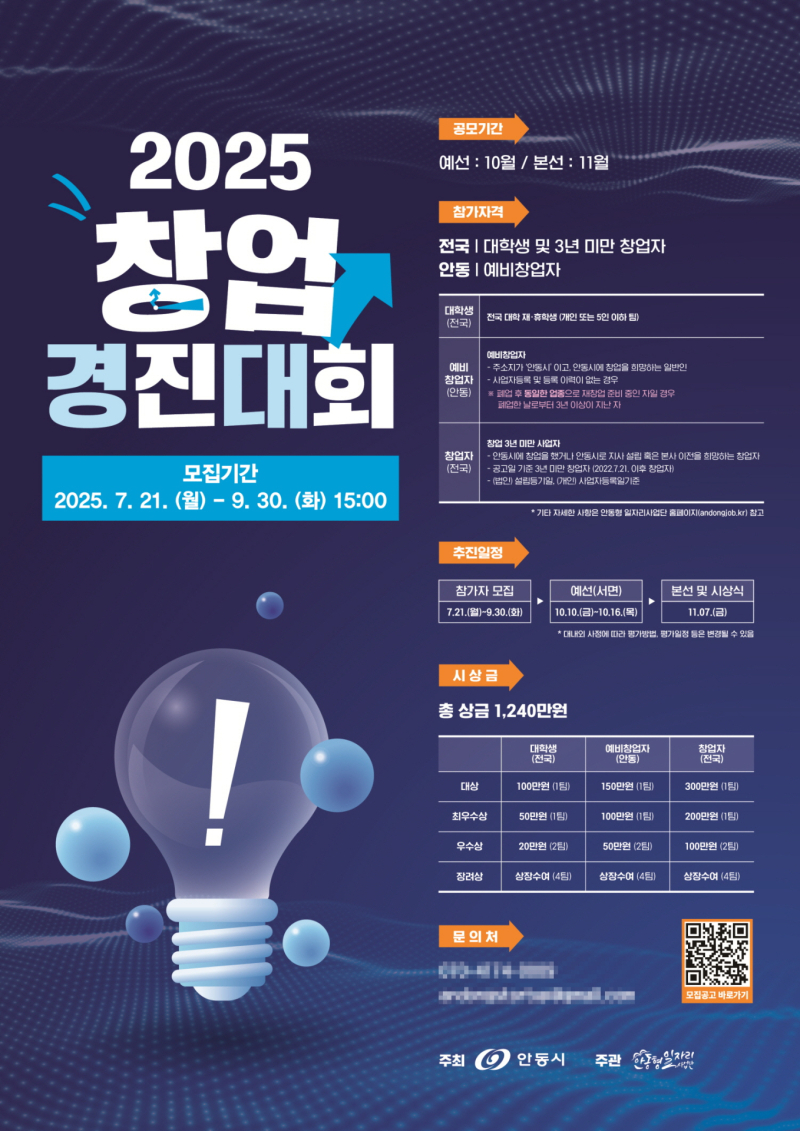 안동시는 오는 30일까지 ‘2025 창업경진대회’ 참가자를 모집한다고 14일 밝혔다. 이번 대회는 참신한 아이디어를 가진 예비 창업자를 발굴해 체계적으로 지원하고 성공적인 창업 사례로 육성하기 위해 마련됐다.