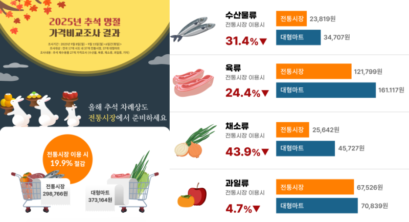 조사결과 4인기준 올 추석 차례상을 차리는데 드는 비용은 전통시장이 평균 29만 8766 원이고 대형마트는 평균 37만 3164 원으로 전통시장이 대형마트에 비해 19.9%인 7만 4398 원 가량 저렴한 것으로 집계됐다.