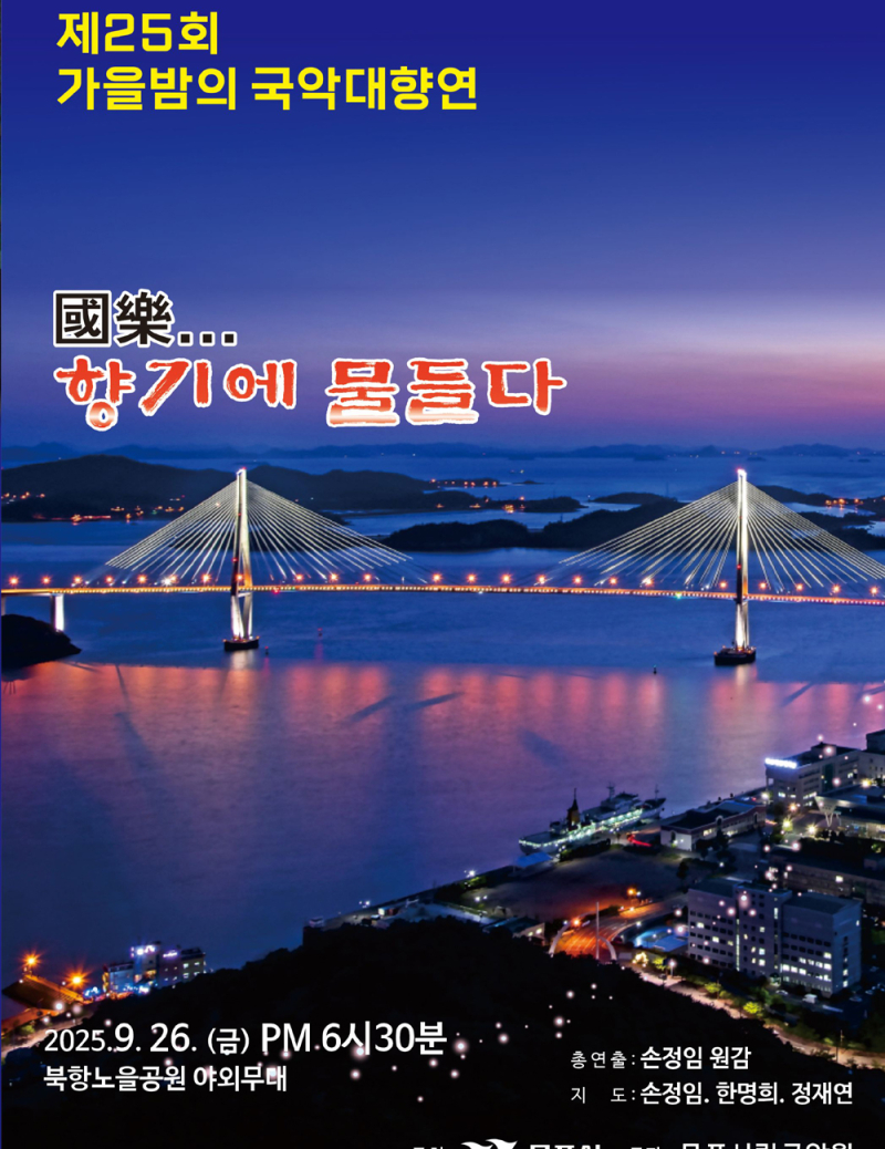 ‘가을밤의 국악대향연 – 國樂, 향기에 물들다’를 주제로 열리는 이번 무대는 국악원생들의 민요 합주를 시작으로 검기무, 기악연주 등 가(歌)·무(舞)·악(樂)이 어우러진 다채로운 공연이 이어진다.