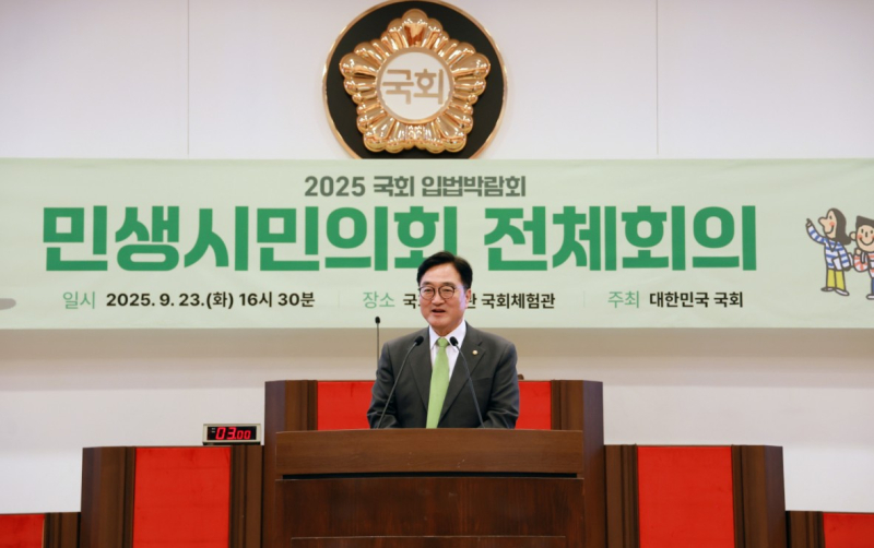 우원식 국회의장은 23일 국회박물관에서 열린 2025 국회 입법박람회 민생시민의회에 참석했다. 우 의장은 “이번 시도는 대의민주주의의 한계를 보완하는 공론의 장”이라며 “사회적 갈등을 풀어내고 정책의 정당성을 높이는 제도로 발전하길 기대한다”고 밝혔다.
