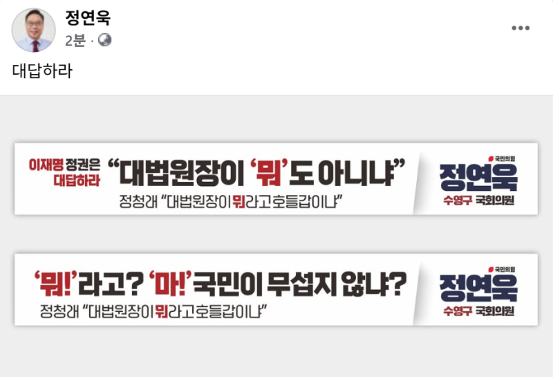 정연욱(국민의힘, 수영) 국회의원은 25일 정청래 더불어민주당 대표의 발언에 "대법원장이 '뭐'도 아니냐"고 강하게 비판했다.