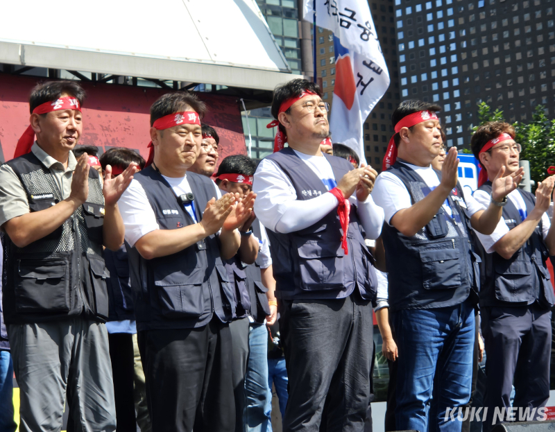 이날 단상에 오른 김형선 금융노조 위원장은 파업의 정당성을 역사적 투쟁에 빗대어 호소했다. 김 위원장은 “2002년 우리 금융노조 선배들의 피와 땀으로 주 5일제를 쟁취했듯, 오늘 우리는 노동시간 단축의 역사를 다시 쓰기 위해 모였다”며 “주 4.5일제는 저출생, 지방 소멸 같은 복합 위기를 돌파할 해법이자 우리 아이들에게 축제 같은 세상을 만들어주자는 약속”이라고 목소리를 높였다.