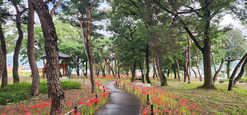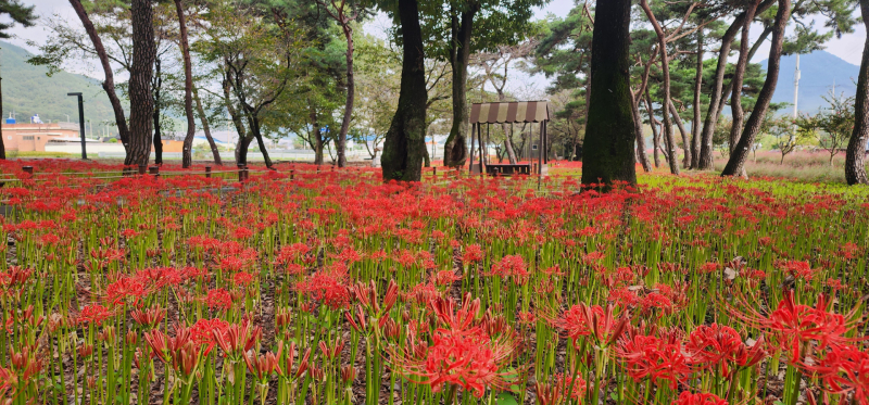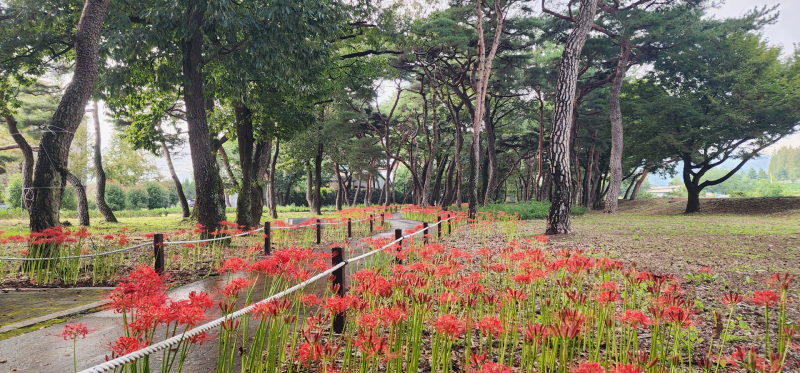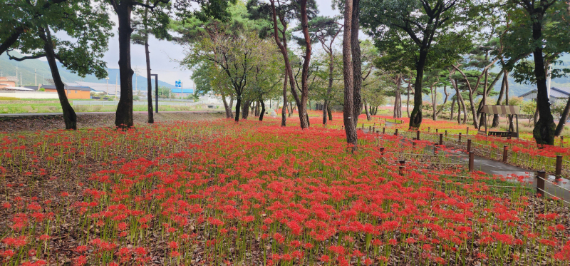 28일 참사랑이라는 꽃말을 가진 꽃무릇이 의령 신포숲에 만개해 시선을 끌고 있다.