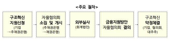 협약에 따라 기업이 주채권은행에 구조혁신 지원을 신청하면, 주채권은행은 해당 기업에 채권을 보유한 채권은행을 대상으로 자율협의회를 소집, 공동실사를 거쳐 사업재편계획의 타당성을 검토한다. 자율협의회 운영 기준은 채권액 기준 ‘4분의 3’ 이상 찬성으로 의결한다. 이후 승인 절차를 거쳐 금융지원이 집행된다. △만기연장 △이자유예 △이자율 조정 △추가담보 취득 제한 등이 지원항목에 포함된다. 필요 시 신규자금도 투입 가능하다.